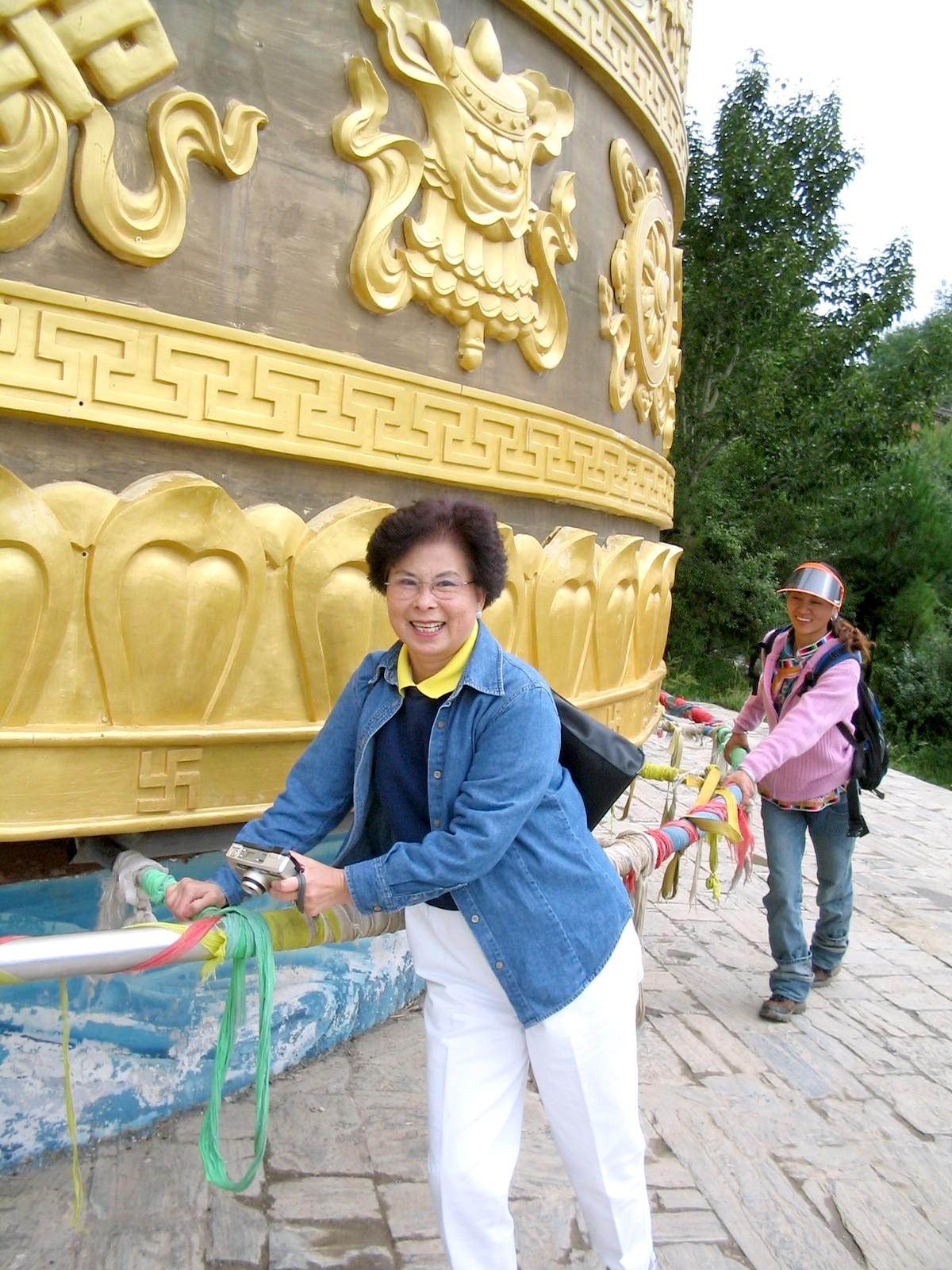 A 60-ton prayer wheel in Shangri-La, being turned by my aunt and a tour guide